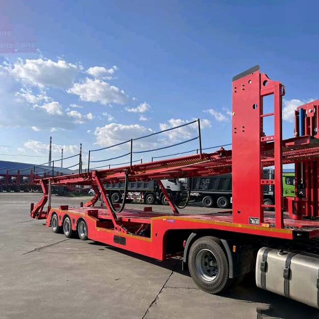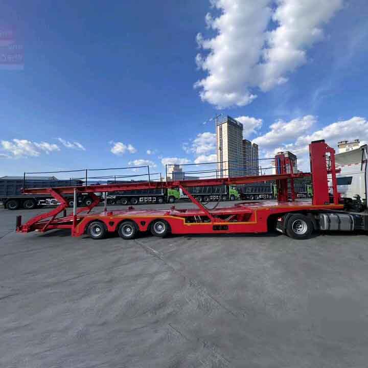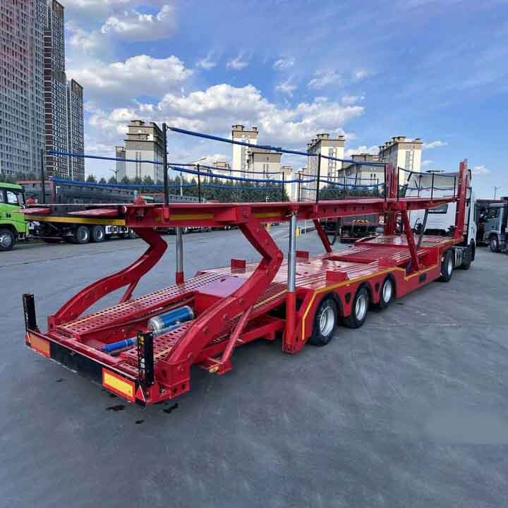 รถกึ่งพ่วงบรรทุกตู้คอนเทนเนอร์ 3 เพลา 8 ออกแบบมาสำหรับการขนส่งรถยนต์ทำจากเหล็กโลหะผสมที่มีความแข็งแรงสูงพร้อมความสามารถในการรับน้ำหนักที่แข็งแกร่งและทนทาน การออกแบบโครงสร้างสองชั้นช่วยเพิ่มประสิทธิภาพการขนส่งได้อย่างมีประสิทธิภาพ และยังมีอุปกรณ์ยึดขั้นสูงเพื่อความปลอดภัยและเสถียรภาพของรถในกระบวนการขนส่ง นอกจากนี้ ยานพาหนะยังรวมระบบตรวจสอบอัจฉริยะเพื่อให้เกิดการตรวจสอบแบบเรียลไทม์และการจัดการกระบวนการขนส่งที่มีประสิทธิภาพ ซึ่งใช้กันอย่างแพร่หลายในด้านลอจิสติกส์ยานยนต์ ทั้งสองด้านของตัวถังมีทางลาดที่สะดวกสบายและอุปกรณ์ล็อคเพื่อความปลอดภัย ซึ่งสะดวกต่อการบรรทุกและซ่อมรถอย่างรวดเร็วทำให้มั่นใจในความปลอดภัยระหว่างการขนส่ง