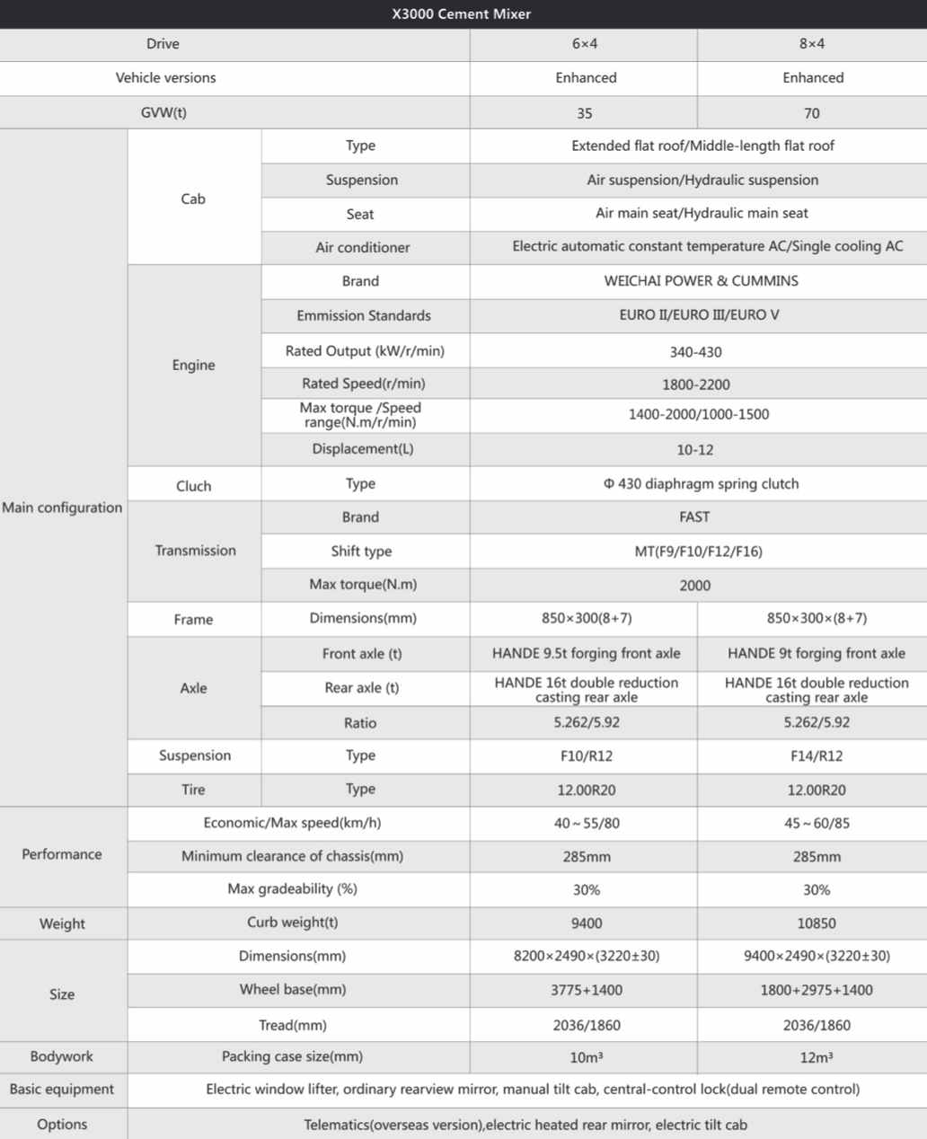 แชสซีมาพร้อมกับเครื่องยนต์ Wuxi Chaiwei WP10/WP12 ที่มีกำลังสูงสุดตั้งแต่ 350 ถึง 460 แรงม้า มันถูกจับคู่กับการส่งผ่านความเร็ว 12 สปีดของ Fatai และเพลาทางเทคนิค Hande Man เหมาะสำหรับเงื่อนไขการก่อสร้างที่ซับซ้อน ห้องโดยสารใช้การออกแบบช่วงล่างสี่จุดและติดตั้งที่นั่งดูดซับถุงลมนิรภัยซึ่งช่วยเพิ่มความสะดวกสบายของผู้ขับขี่อย่างมีนัยสำคัญ พื้นผิวของถังผ่านการรักษาด้วยการพ่นทรายป้องกันการกัดกร่อนและสามารถติดตั้งระบบสเปรย์เสริมเพื่อป้องกันไม่ให้คอนกรีตยึดติด รางปลดปล่อยด้านหลังสามารถหมุนได้ 270 องศาและคันโยกปฏิบัติการจะถูกจัดเรียงจากส่วนกลางทางด้านขวาของยานพาหนะช่วยอำนวยความสะดวกในการควบคุมบุคคลเดียวที่แม่นยำ ยานพาหนะทั้งหมดเป็นไปตามมาตรฐานการปล่อยก๊าซเรือนกระจกแห่งชาติ VI และเป็นโซลูชั่นการขนส่งคอนกรีตที่มีประสิทธิภาพและเป็นมิตรกับสิ่งแวดล้อมสำหรับโครงการก่อสร้างในเมือง